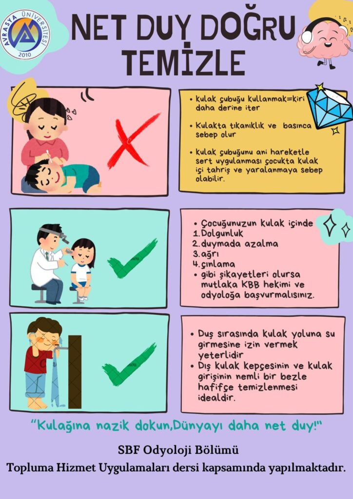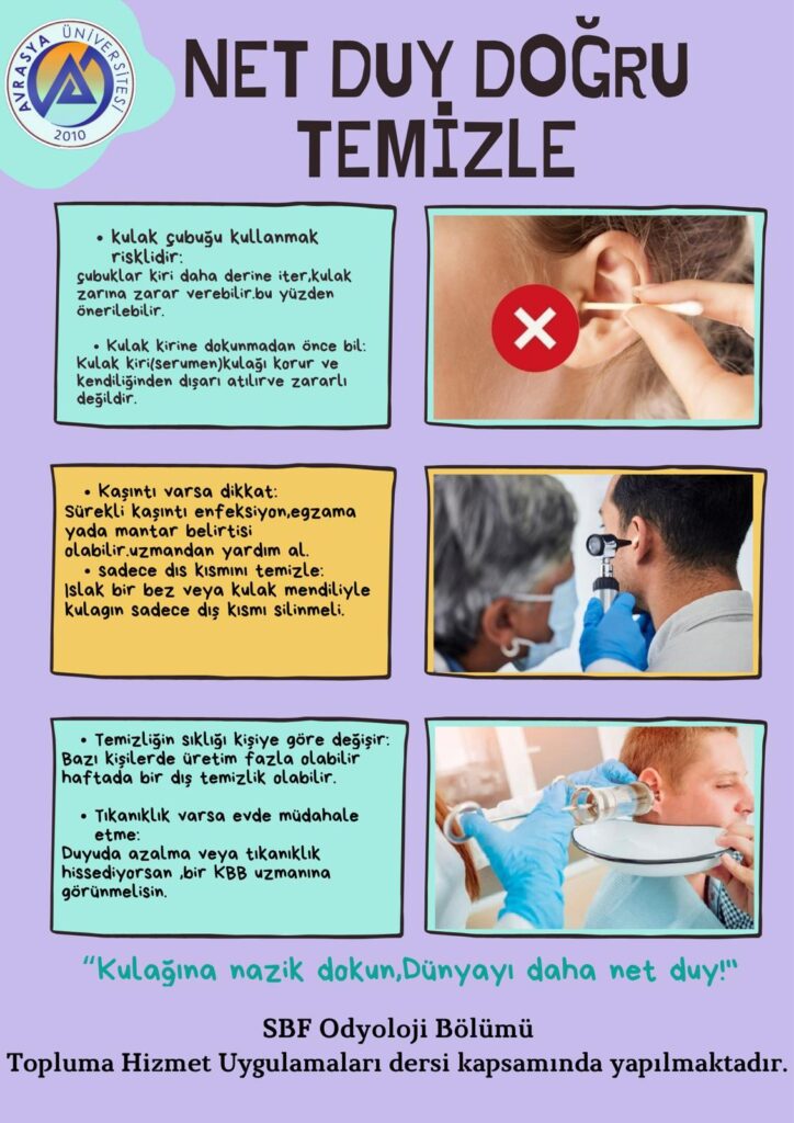 Avrasya Üniversitesi Sağlık Bilimleri Fakültesi Topluma Hizmet Uygulamaları dersi kapsamında Odyoloji Bölümü öğrencileri, işitme sağlığına yönelik farkındalık oluşturmayı amaçlayan “Net, Duy, Doğru, Temizle” adlı sosyal sorumluluk projesini hayata geçirdi.